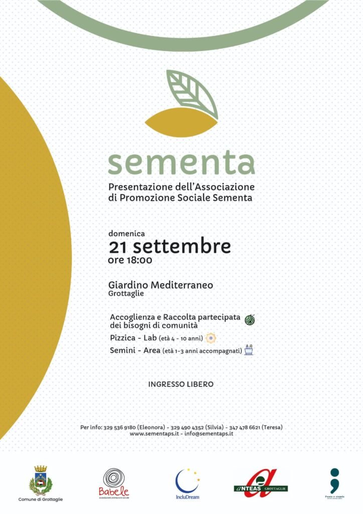 Con grande emozione, vi invitiamo all’inaugurazione della nostra associazione che si terrà il 21 settembre alle ore 18:00 a Grottaglie, al giardino Mediterraneo, adiacente al Castello Episcopio.