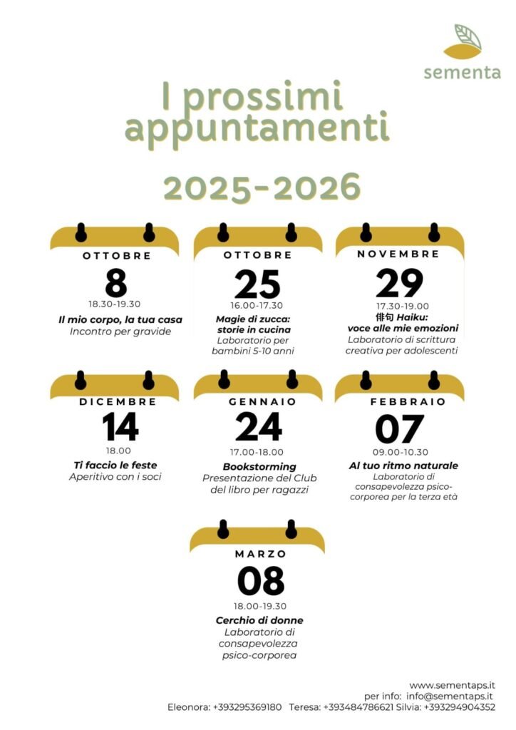Tutti gi appuntamenti richiedono una prenotazione, trovate i nostri contatti nella pagina del sito dedicata.
